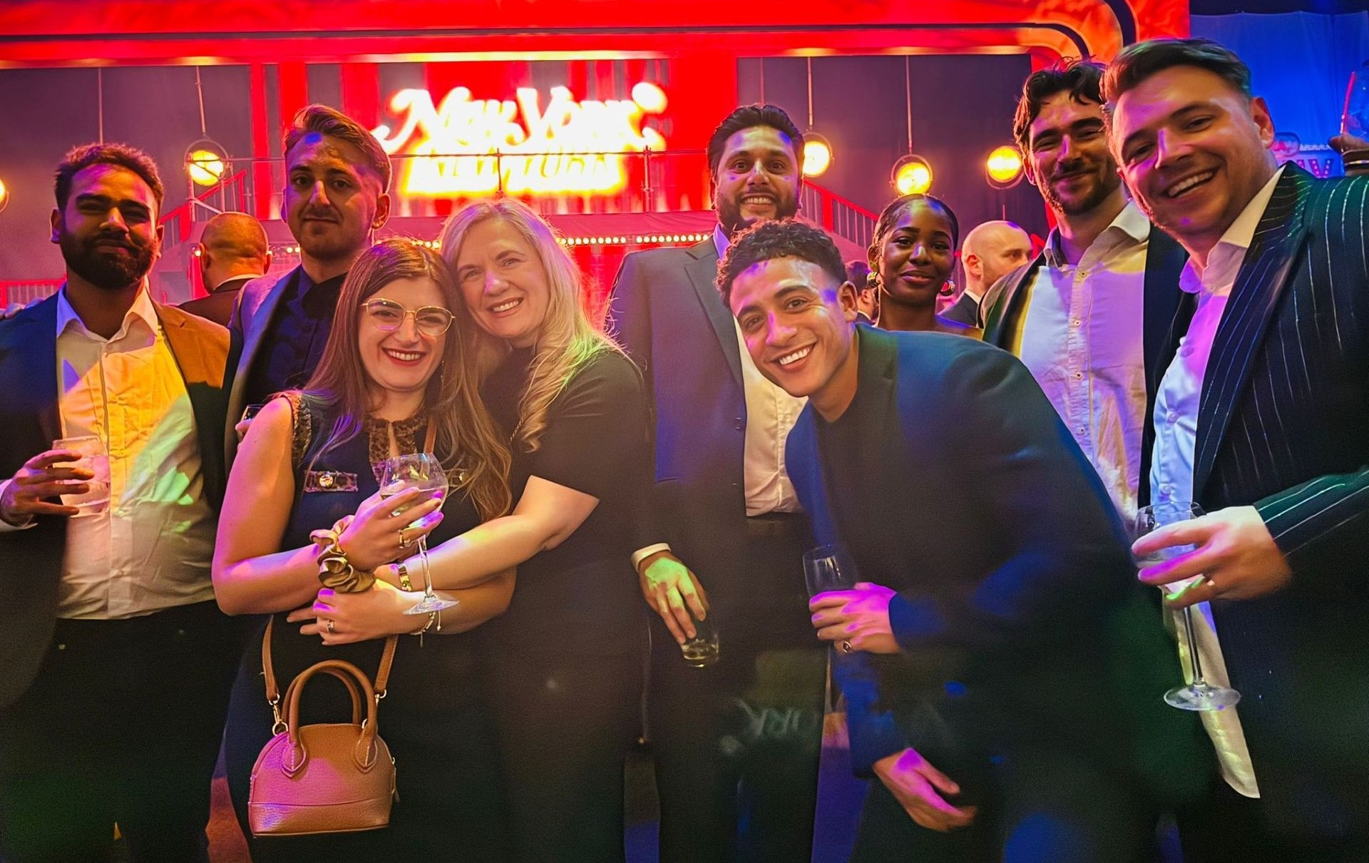 After exchanging our Secret Santa gifts, with bags full of candles and socks, we head to the entrance of the majestic New York New York 2025 Shared Christmas Party.